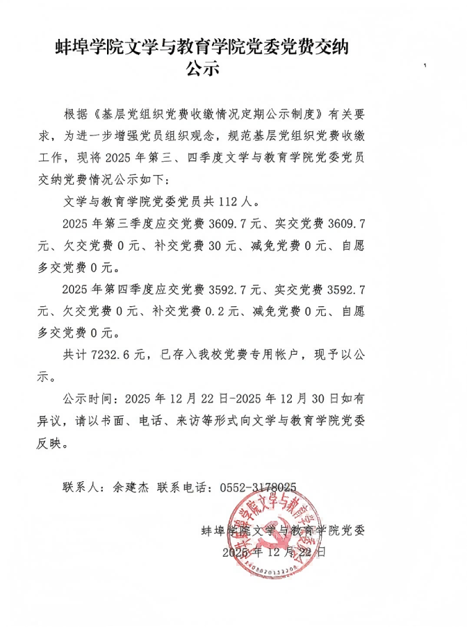蚌埠学院文学与教育学院党委第三、四季度党费交纳公示