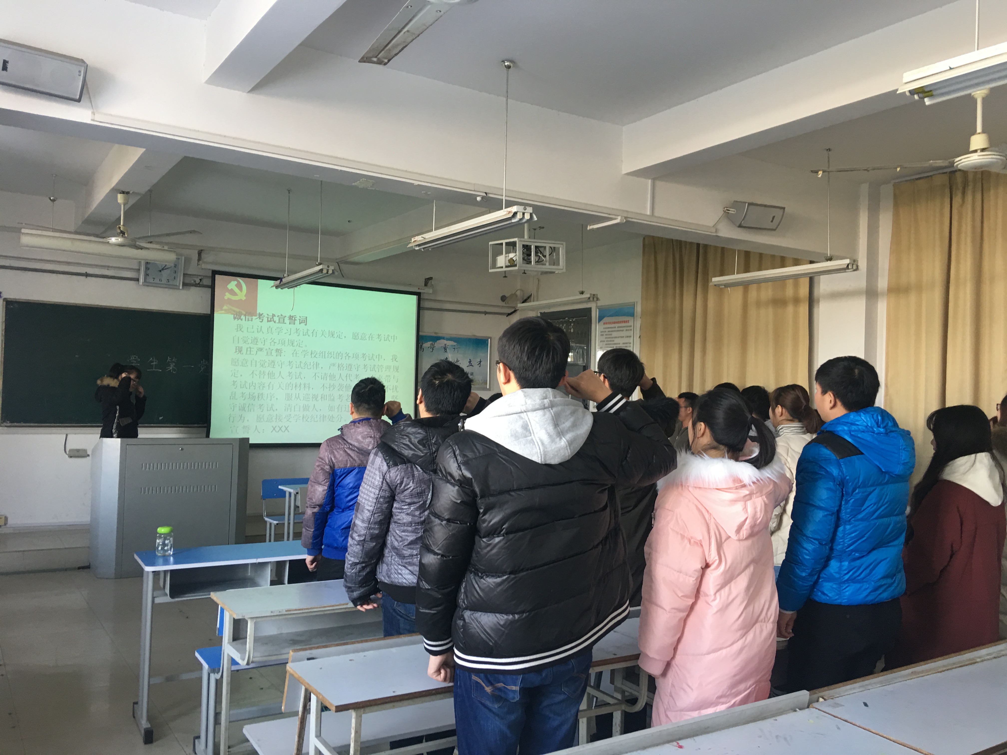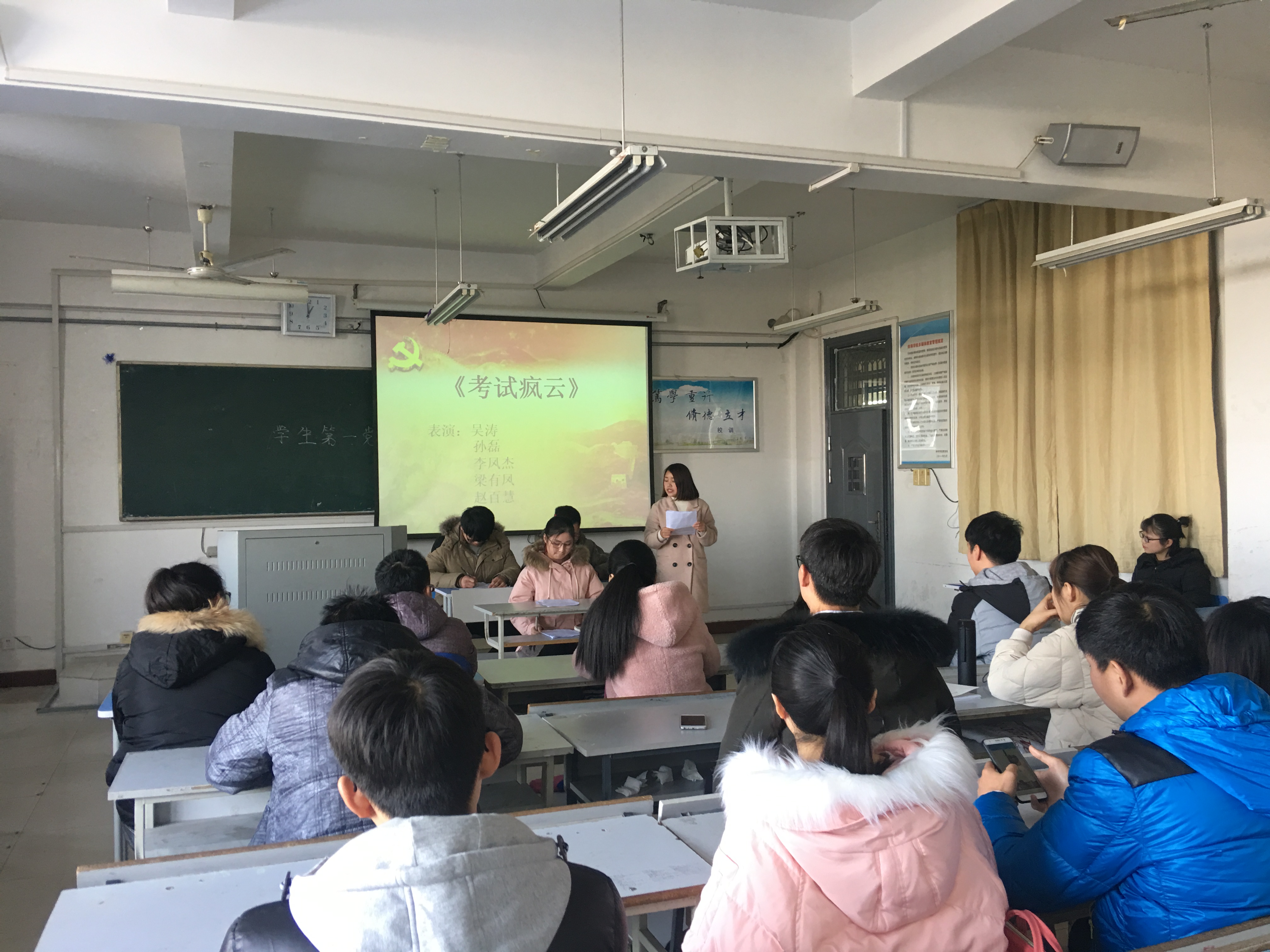 会上,刘鑫教育学生党员在期末考试中应当以身作则,诚信考试,养成良好的考试风气,培育良好的学风。学生党员张妮首先带领支部成员学习《蚌埠学院学生手册》的部分条例,讲述诚信考试的重要性和必要性。在接下来的知识竞答环节中,同学们围绕考试制度方面的题目,纷纷举手抢答,在热烈的氛围中重温有关诚信和教育方面的相关知识。非毕业班的学生党员们自编自导自演的话剧《考试“疯”云》,为党日活动掀起了小高潮,让大家在欢乐的氛围中学习了诚信考试的相关规则,同时也加强了对党员的思想教育。最后,张妮带领支部成员全体起立进行诚信考试宣誓,让诚信的种子在同学们的心中生根、发芽、开花、结果。