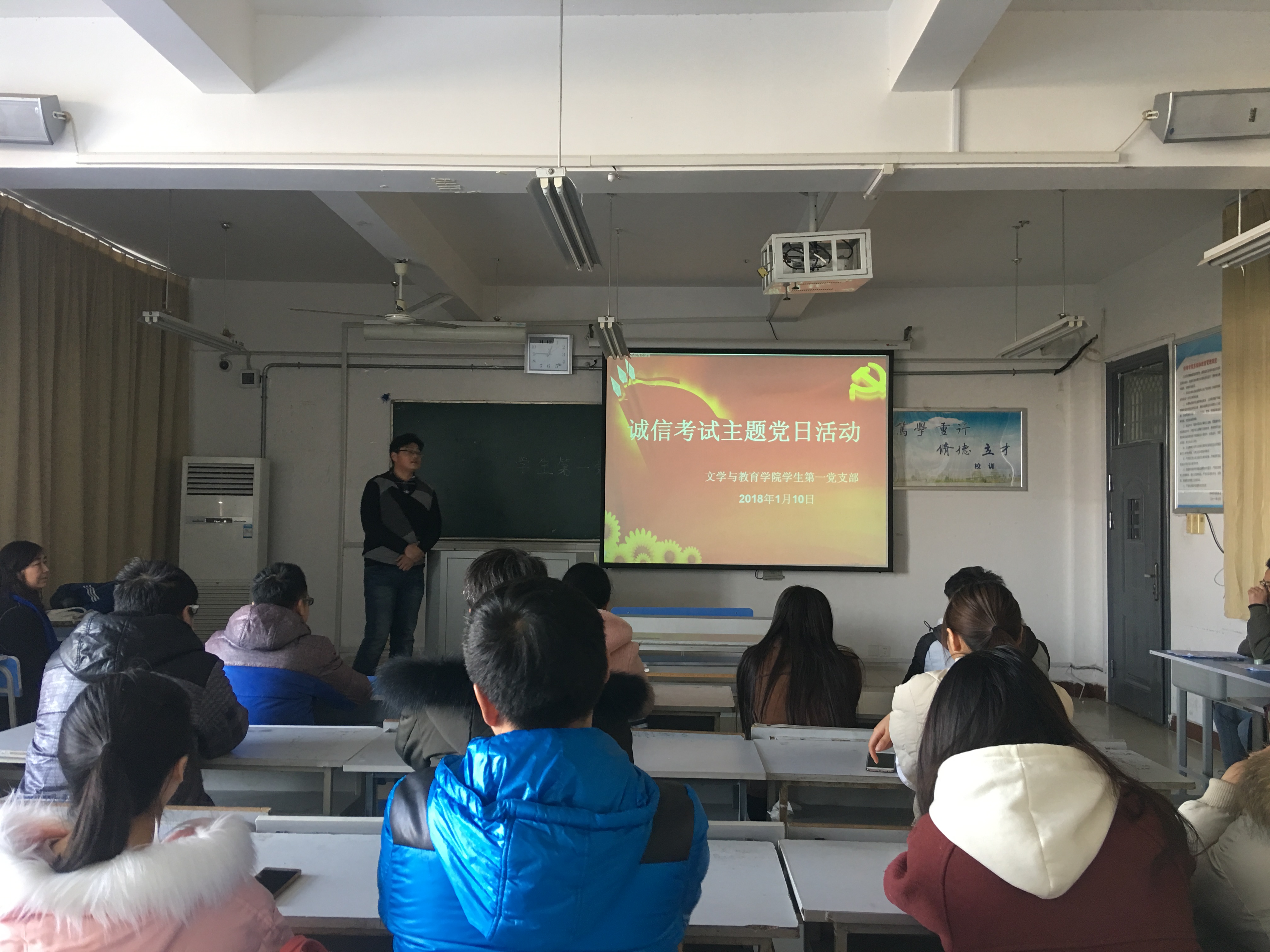 期末临近,为深化“两学一做”学习教育常态化制度化,引导广大学生认真复习迎考,1月10日中午,文学与教育学院学生第一党支部在B318开展了诚信考试主题党日活动。此次活动由支部组织委员刘鑫主持,支部成员悉数参加。