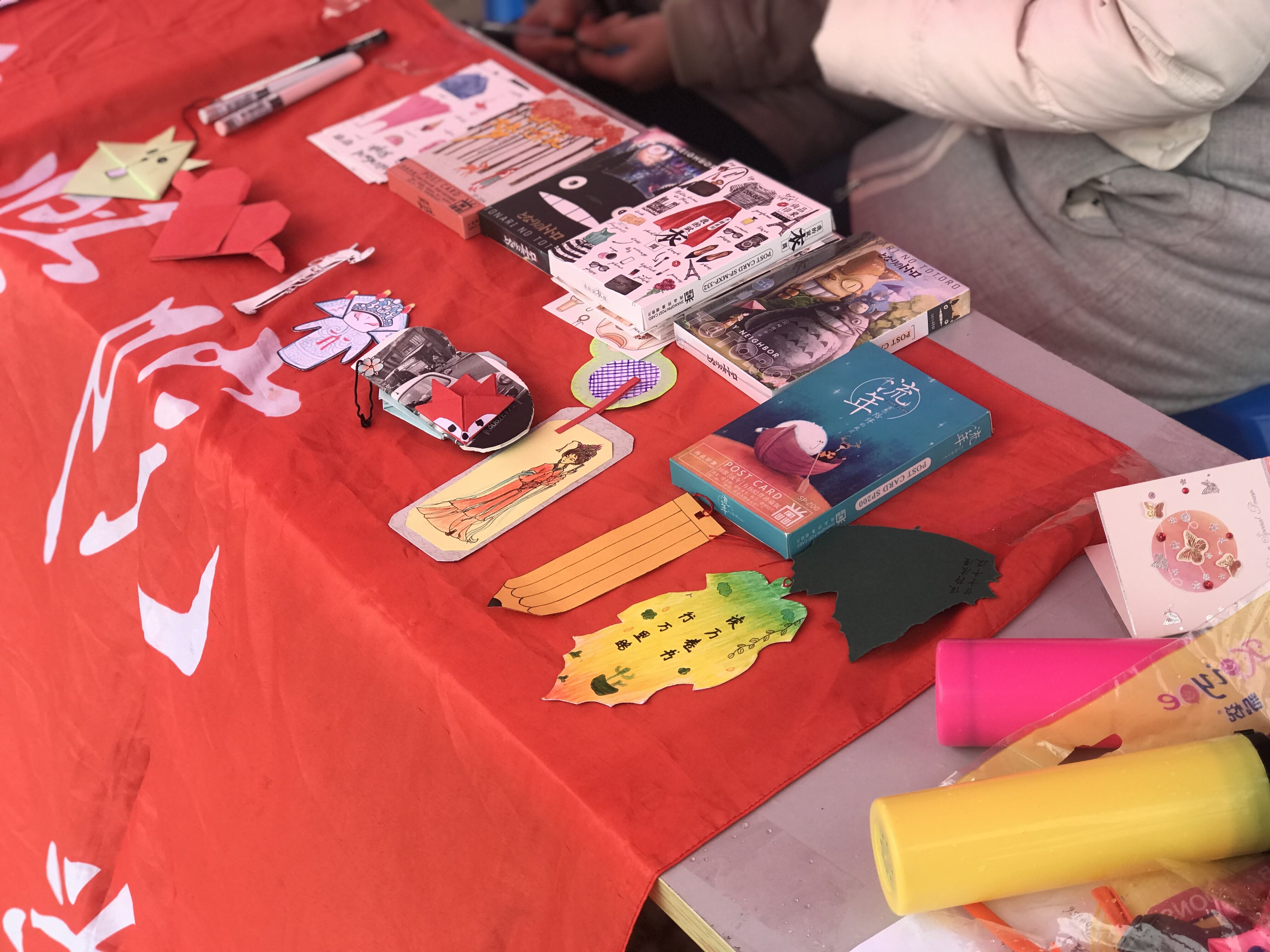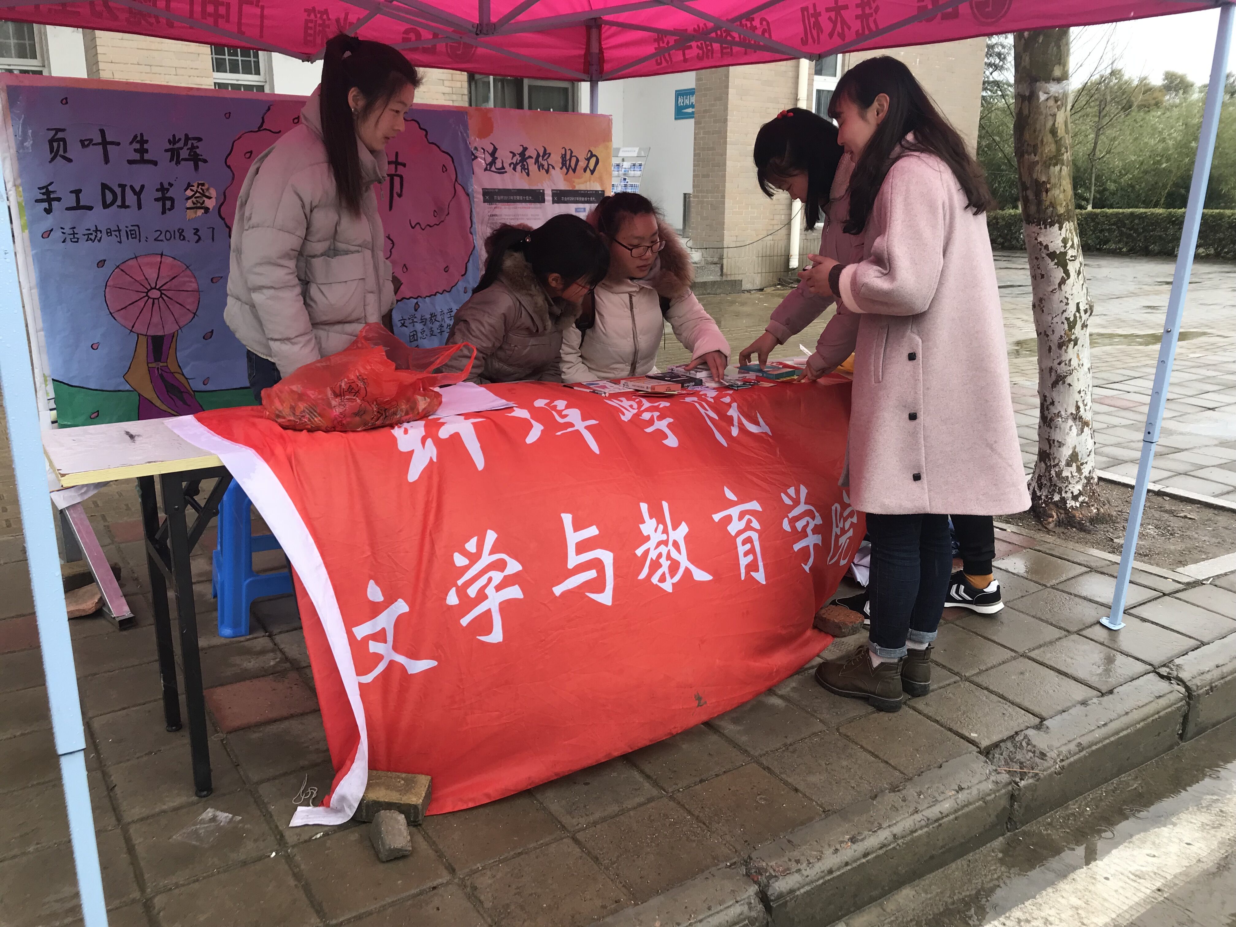 3月7日,伴随着小雨和冷风,文教学子们轮流在学校主干道摆台,收集同学们自己制作的精美书签,并在展板上展出,并对所有参与活动的同学送出甜甜的小糖果以及精美的明信片祝福。