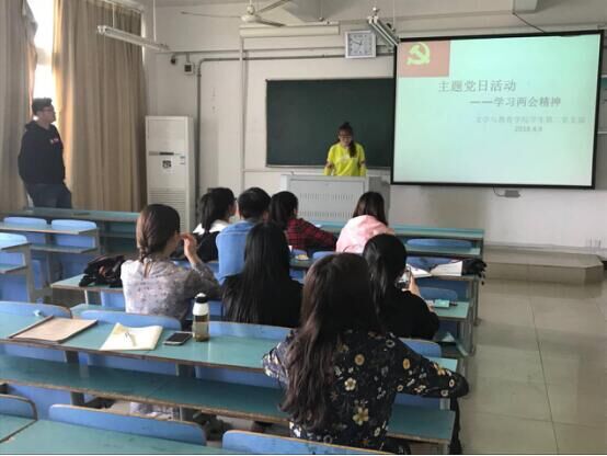 2018年4月9日,文学与教育学院学生第二党支部在教学楼开展了主题党日活动,集体学习全国两会精神,号召全体学生党员自觉履行先锋模范作用,争做合格党员。
