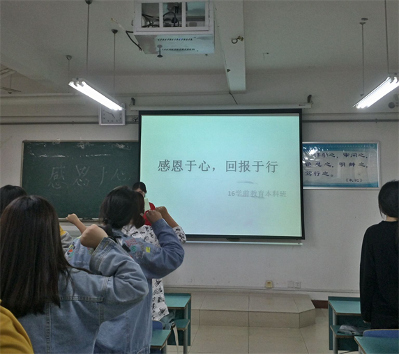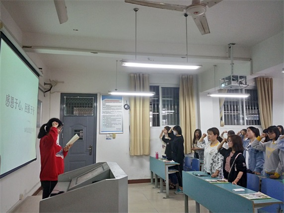活动开始,鲁冰冰老师带领大家进行了“感恩于心,回报于行”的签名。然后,资助委员凌森惠带领大家宣誓:“永怀感恩之心,常做感恩之事;滴水之恩,涌泉相报;感恩生活的馈赠、感恩父母的养育、感恩学校的培育、感恩师长的教导、感恩同学的帮助、感恩挚友的知遇,将感恩回报于行动之中。”“鸦有反哺之意,羊有跪乳之恩”,每个人在生活之中都少不了别人的帮助,但我们不能理所当然地接受别人的恩惠,我们应常怀感恩之心,真诚的对帮助我们的人表示感谢,并在以后的生活学习中用行动传递自己的友善,感恩于心,回报于行。(撰稿:鲁冰冰)