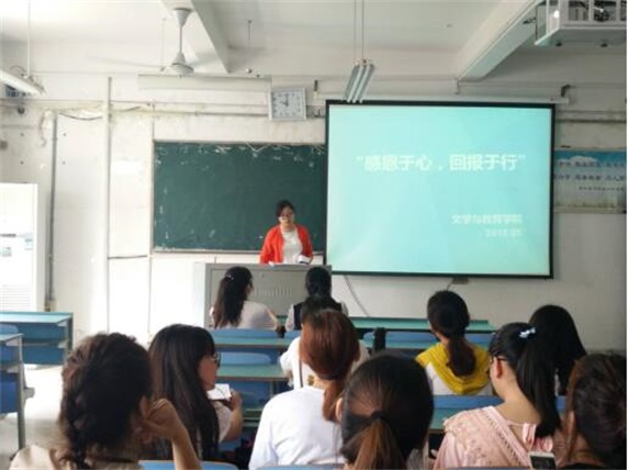 为响应学校资助诚信教育主题月活动,教导学生常怀感恩之心,文学与教育学院2018年5月15日在教学楼B313举行“感恩于心,回报于行”的签名、宣誓活动。