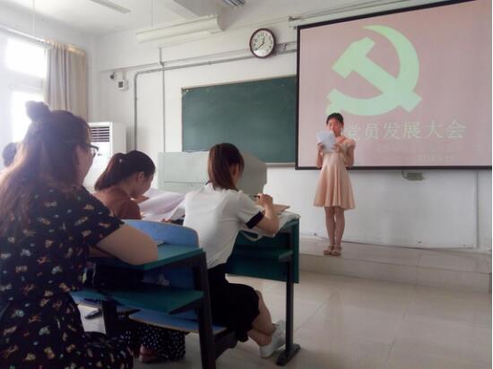 大会根据党员发展的程序,由四位发展对象宣读自己的入党申请书,详细汇报了自己在积极分子期间的表现,并对自己在考察期间思想学习和工作上的进步以及不足做出了认真的总结反思。支部书记刘鑫老师介绍了四位发展对象的情况,并给与了充分的肯定。然后,支部组织委员张妮同志向大会报告了这四位同志的政审情况。经过与会党员无记名投票,同意接收四位同志为中共预备党员。最后,王军伟同志代表发言称,作为一名预备党员,将继续在思想上学习上工作中严格要求自己,全心全意为人民服务。