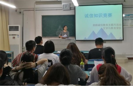 为落实学校资助诚信教育主题月活动要求,2018年6月7日,文学与教育学院在教学楼B324举办诚信知识竞赛,参加本次活动的有辅导员刘鑫老师和鲁冰冰老师、各班级的资助委员以及参赛选手。