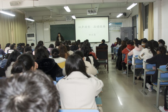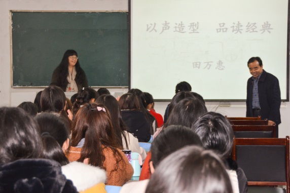 11月21日中午,文学与教育学院资深教师田万惠副教授在B309教室为蚌埠学院师生举办了一场名为《以声造型 品读经典》的讲座。文学与教育学院院长吴长法、副院长何蕾等院内外师生一百余人到场聆听。