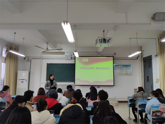 蒋晟同志生动准确的讲解了坚持党员标准,做一名合格党员的重要性。提醒党员同志要时刻铭记党员标准,常回忆、常反思,以高标准严格要求自己,深刻领会党员标准的精神实质,并对照检查,严格要求自己,切实付诸实践;要熟记共产党员的八项义务和八项权利,并将八项义务总结为:学习、模范、奉献、遵纪、团结、批评、联系群众、献身这八个词语,帮助同学理解记忆。蒋晟同志强调,共产党员永远是劳动人民的普通一员,作为学生党员,大家做到积极学习科学文化知识的同时更要做到积极学习党的路线、方针、政策和决议;在学习生活中要乐于奉献、敢于付出,在困难面前要起到模范带头作用;并告诫同学无论在公开场合还是在私人场合都要注意言行,对照党员标准找出自己的差距,加强党性修养,争做合格党员。