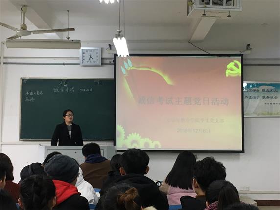 为了强化诚信行为,树立规则意识,加强诚信观念,营造良好的文明考试、诚信做人的氛围,以积极向上的态度认真复习,迎接即将到来的英语四、六级考试、研究生入学考试以及期末考试,2018年12月6日,文学与教育学院学生第一、二、三党支部在教学楼B324开展诚信考试主题党日活动。本次活动由学生第一党支部组织委员郑万莉主持,第二支部组织委员舒江慧进行宣讲,三个支部全体党员和部分发展对象参加。