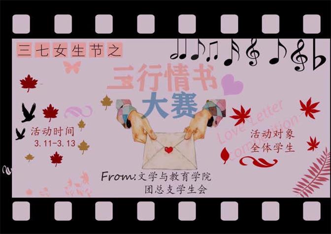 “挥笔泼墨愿为你书锦绣山河,花前月下愿为你唱几世情歌。”情书,是爱意的寄托;情书,是情感的表达。为了丰富同学们的校园文化生活,增强校园文学气氛,3月12日文学与教育学院团总支举办了女生节系列活动之“三行情书”。本次征文大赛面向蚌埠学院全体在校学生,旨在以三行情书的形式,鼓励同学们表达自己的心声,传递真心、传递爱。