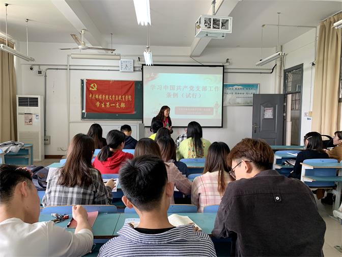 会议开始,由党支部组织委员郑万莉同志带领全体党员同学认真学习了《中国共产党支部工作条例(试行)》。《条例》以习近平新时代中国特色社会主义思想为指导,贯彻党章要求,既弘扬“支部建在连上”的光荣传统,有体现基层创造的新做法新经验,对党支部工作作出全面规范。预备党员陈阳带着大家一起学习了中共蚌埠学院委员会2019年党的建设工作要点,共有八个部分,二十二条要点,从各方面深入学习了2019年学校党的建设工作总体要求。