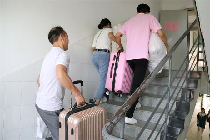 校内迎新工作也进行地有条不紊。在西门和东门处均设有迎新人员,带着新生到他们本专业班级助理处报道,并领取饭卡、宿舍钥匙以及缴费凭条等。迎新人员不仅热情地向新生介绍学校内外的情况和需要注意的各种事项,如校园卡的使用、在学校必须要用到的手机软件等等,也积极耐心地解答新生的各种疑问,让新生感受到家一样的温暖。