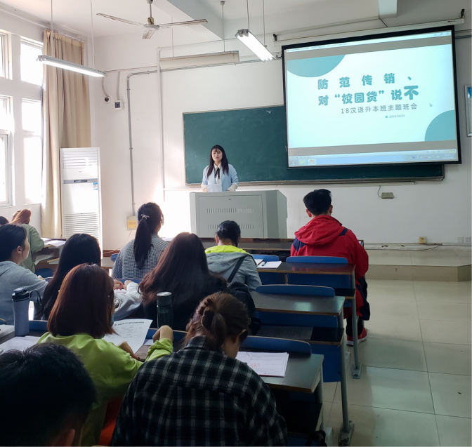 2019年10至11月份,文学与教育学院开展了校园防范传销、“套路贷”“校园贷”宣传教育。学院各个班级为宣传预防校园贷知识,营造健康的校园氛围,在教学楼以班级为单位开展了“预防校园贷”主题班会。