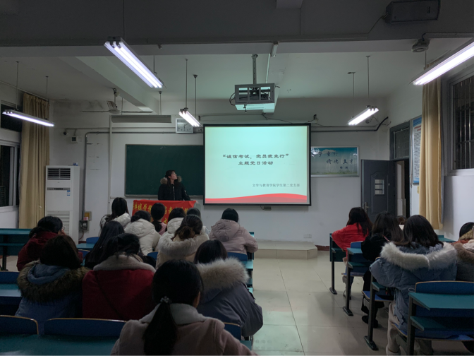为加强同学们的诚信观念,提高诚信考试意识,发挥先锋作用,文学与教育第二党支部12月23日晚在B315教室开展“诚信考试,我先行”主题党日活动。党支部书记董琬如主持此次活动,党支部全体党员和全体预备党员参加活动。
