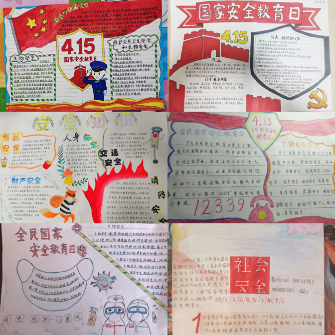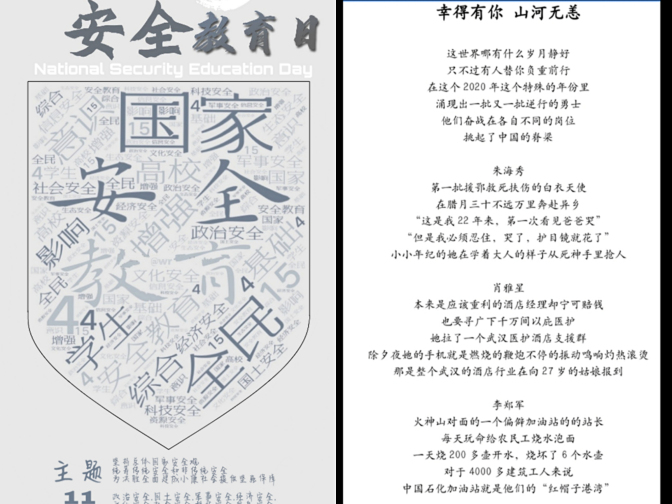 “疫情无情,人有情/无论你们是医生、商人、军人、普通人都是会在国家最危难的时候随时待命的人/谢谢所有为武汉拼过命的你们/世界将记住你们的名字幸得有你,山河无恙”刘晓敏同学通过诗歌歌颂了医生朱海秀、酒店经理肖雅星、加油站站长李郑军等援鄂英雄。张思敏、陈思思、宋雪梅、施玉婷、徐曼等小学教育的同学则发挥自己在画画方面的特长,通过简单的手抄报等形式图文并茂的向我们传达了国家安全相关方面的知识。王润同学则通过网上海报的形式做了一面盾,上面写着“国家安全教育、政治安全、经济安全、军事安全、科技安全、国土安全、文化安全……”向我们传递着国家安全就像一面盾,是有政治、经济、文化、全民……多种多样的元素组合而成,国家安全缺一不可。