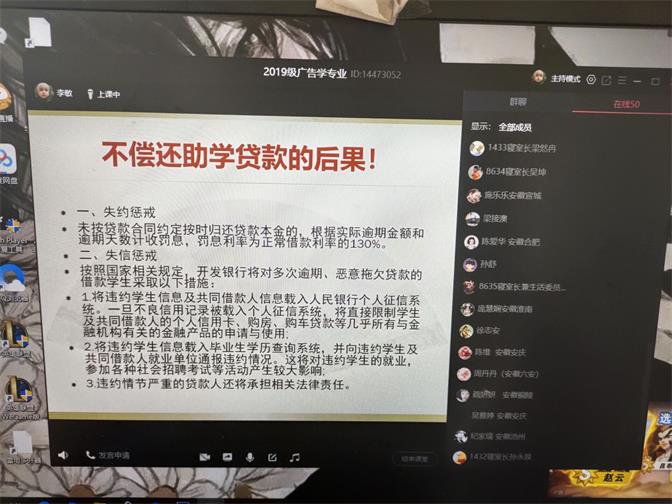 各班级通过使用QQ群、钉钉等多种线上渠道,使用视频讲解、PPT 解说、语音分享故事和上传电子版演讲稿等方式开展此次班会,亦称为“云班会”。班会活动准备分别是个人对自强的解读,诚信故事的分享,诵读有关感恩文章(节选),识别“校园贷”、“隐形贷”等形式的非法借贷风险和危害,严防诈骗、套路贷、不良贷等风险,向贷款学生宣讲征信及诚信知识,讲解还款流程,让每位贷款学生充分认识到信用违约及不良征信记录可能带来的严重后果。随着活动内容的开展,同学们在线上纷纷分享自己的见解与收获。