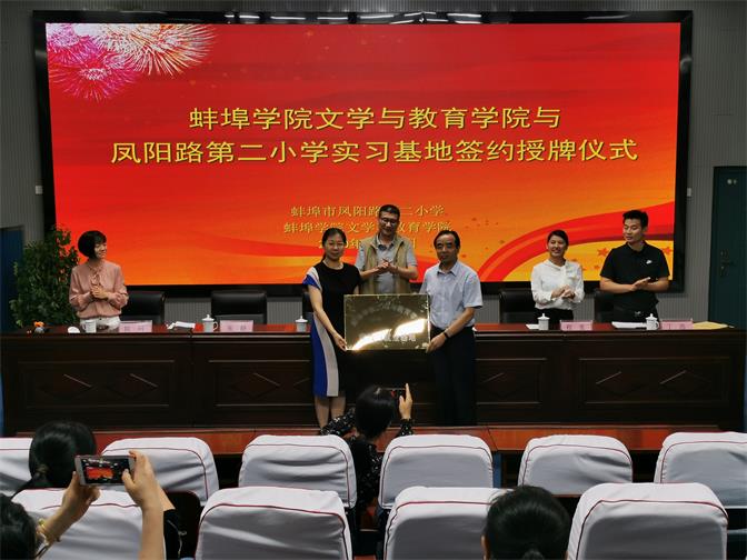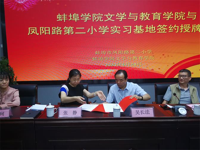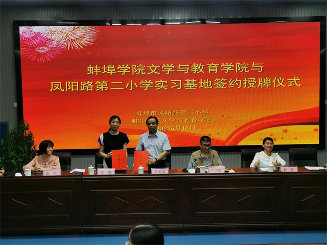 2020年6月18日下午,文学与教育学院实践与就业基地签约授牌仪式在凤阳路第二小学举行。龙子湖区教体局高度重视此次活动,副局长王卫东亲临现场致辞,文学与教育学院院长吴长法、凤阳路第二小学校长张静代表双方签约揭牌。出席本次活动的还有凤阳路第二小学副校长杨静、王耀辉,文学与教育学院教学秘书程雯、小学教育专业负责人丁浩、汉语言文学专业教研室主任陈珂等。