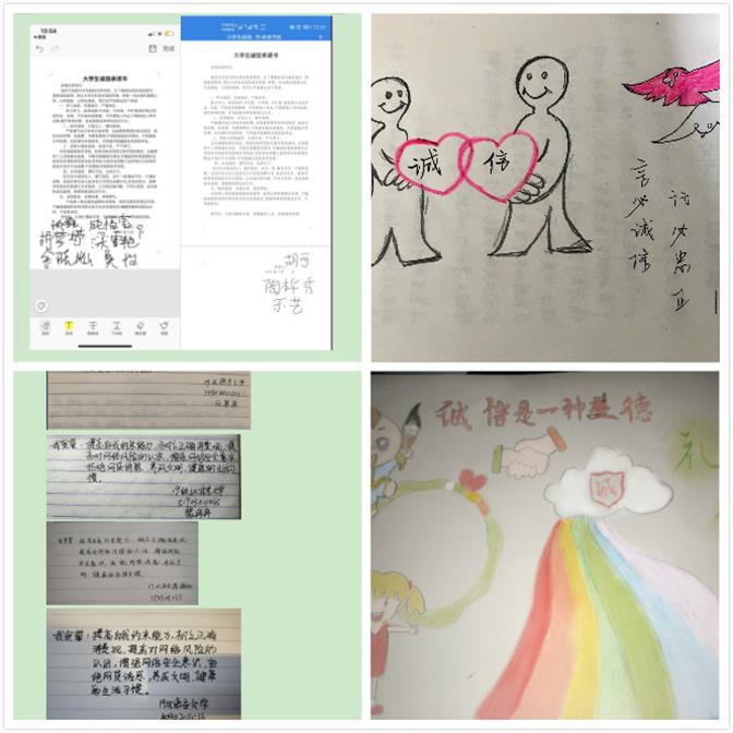 同学们根据诚信主题制作了图画,生动醒目的画作,展示在班级群里,让所有同学都能看到诚信活动的内容,让诚信意识深深扎根在学生心里。在知识竞赛中,同学们通过回答各种诚信资助类的知识题目,增加了知识储备,大家纷纷表示以此为契机,宣传国家资助政策及成效,立志成才、感恩奉献。