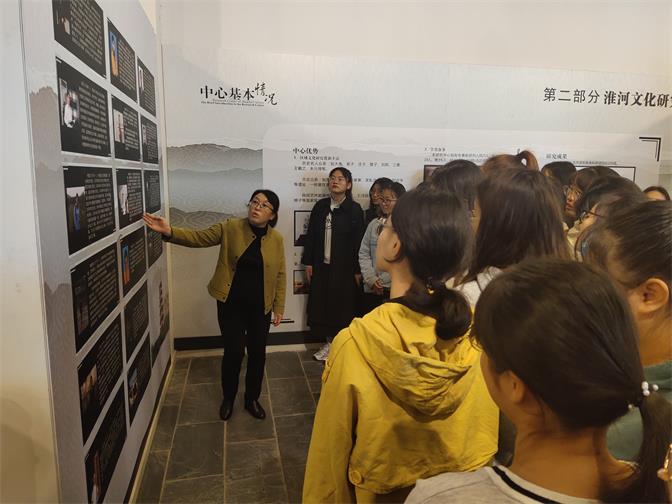 在讲解员的带领下,同学们参观了淮河文化展厅的五个主要部分,从历史介绍、研究教学、发展期望等多个方面深刻了解了淮河流域的独特区域文化和璀璨文明曙光。作为《中国古代文学》课程主讲教师,李艳洁首先向同学们详细讲解了淮河流域的文学发展概况;其次,进一步介绍了在淮河文化研究中,服务教学与社会的骨干教师,展现了我校优秀的师资力量;最后,对同学们的创新训练和科学研究进行了引导,鼓励同学们以淮河流域文学为切入点,积极申报创新训练研究项目,以实现具有高阶性、创新性、挑战度的学习。在参观的过程中,同学们热情讨论、认真思考,以青年视角关注淮河流域历史文明。