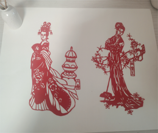 比赛于晚7:00正式开始,在主持人刘艳的主持下,参赛选手按照折纸组、剪纸组、其他组的顺序依次向大家介绍作品,接着向观众与评委展示实物。折纸组蒋络绎的作品“樱花纸球”,以彩纸为原料、以中国结为原型加以流苏点缀,浪漫典雅、意蕴无穷;剪纸组赵雨蝶的作品“红楼梦剪纸”中“元春”、“林黛玉”形神兼备,栩栩如生;其他组张安冉运用衍纸呈现出京剧人物“孙尚香”的形象,独具一格,精美绝伦。