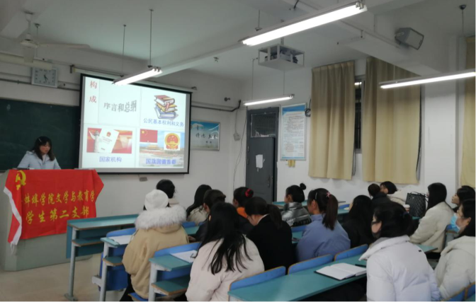 为增强学生的宪法意识、弘扬宪法精神。2020年12月4日,文学与教育学院学生第二党支部在B332教室进行了国家宪法日的主题党日活动。此次活动由党支部书记董琬如老师主持,支部的全体党员参与其中。