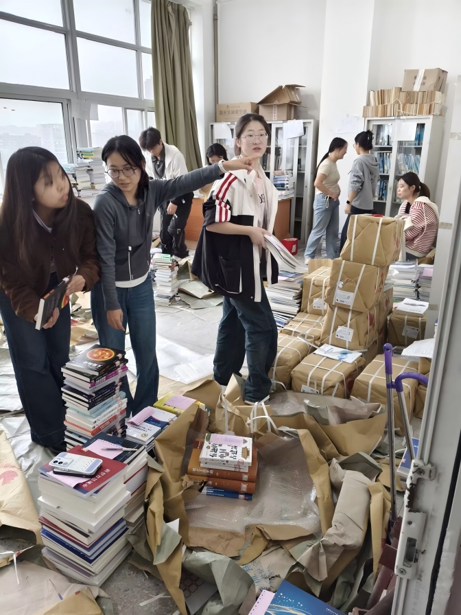 活动筹备阶段,陈珂、王华、寇国庆、薛高领四位指导老师,向学生讲解实践任务与操作规范;图书馆陈晓羽老师则结合各班人数差异,完成精细化分工。实践过程中,1班学生在北六楼库房负责新书验书工作,通过初步门类区分,为图书录入电子资源系统奠定基础;2班、3班学生分别在集成四库、中文⑧库开展书架整合:21名学生以3人一组为单位,扫描图书条形码并录入电子系统生成定位排架号,其余同学则依据书标顺序完成图书上架,实现“扫码定位—按号排架”的数智化操作闭环。